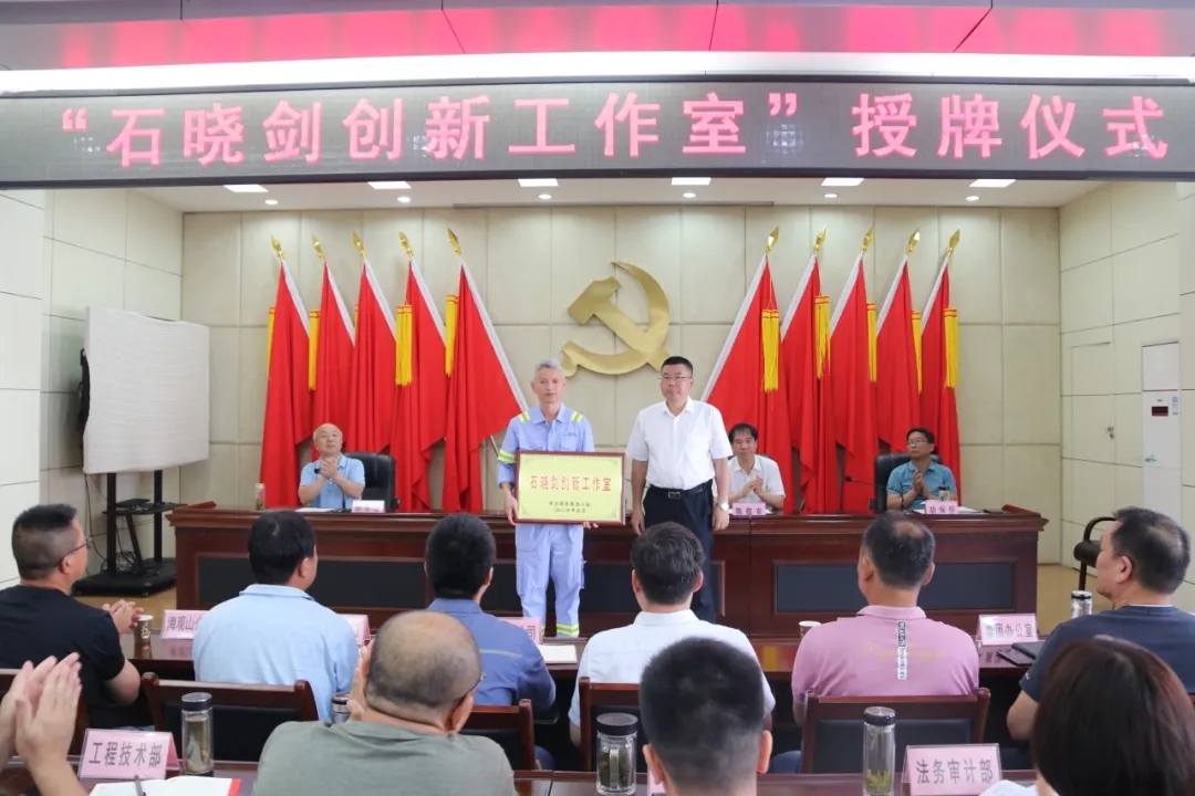 三樓會議室座無虛席,公司領(lǐng)導(dǎo)班子,機(jī)關(guān)部室負(fù)責(zé)人、基層單位分管領(lǐng)導(dǎo)及技術(shù)骨干、職工代表等40余人共同見證授牌時刻。湖北省首席工人技師、公司首席電氣工程師石曉劍進(jìn)行表態(tài)發(fā)言,公司黨委書記、董事長、總經(jīng)理余曦親自將“石曉劍創(chuàng)新工作室”銅牌頒授到石曉劍手上。